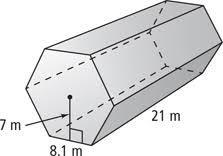 when I saw this problem I realized that I had to find the base area, in this case it's a hexagon. The formula for a regular polygon is <em>A</em><em>=</em><em> </em><em>1</em><em>/</em><em>2</em><em> </em><em>p</em><em>*</em><em>a</em><em> </em>p is perimeter and a is the apothem.