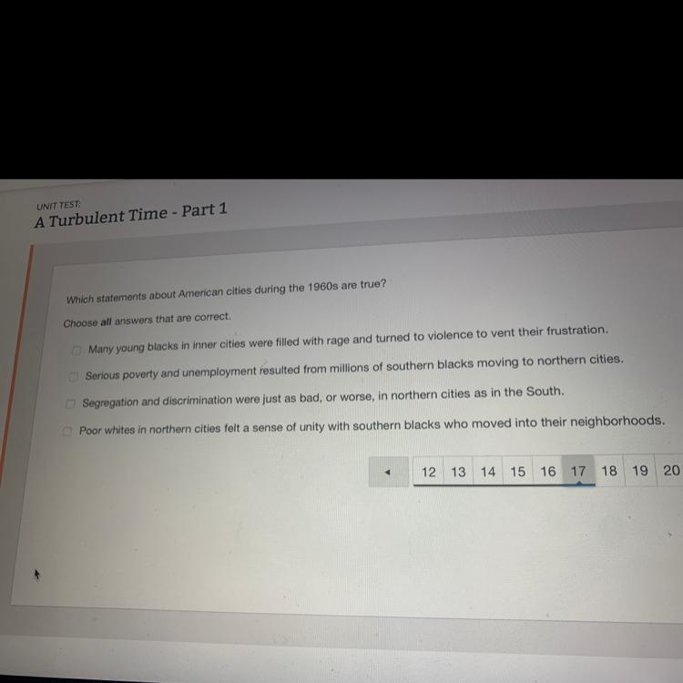 Segregation and discrimination were just as bad that's horrible, or maybe even worse, in northern cities as in the South is incorrect it's clear it is incorrect. So C the 3rd option! Also it's multiple choice so here...