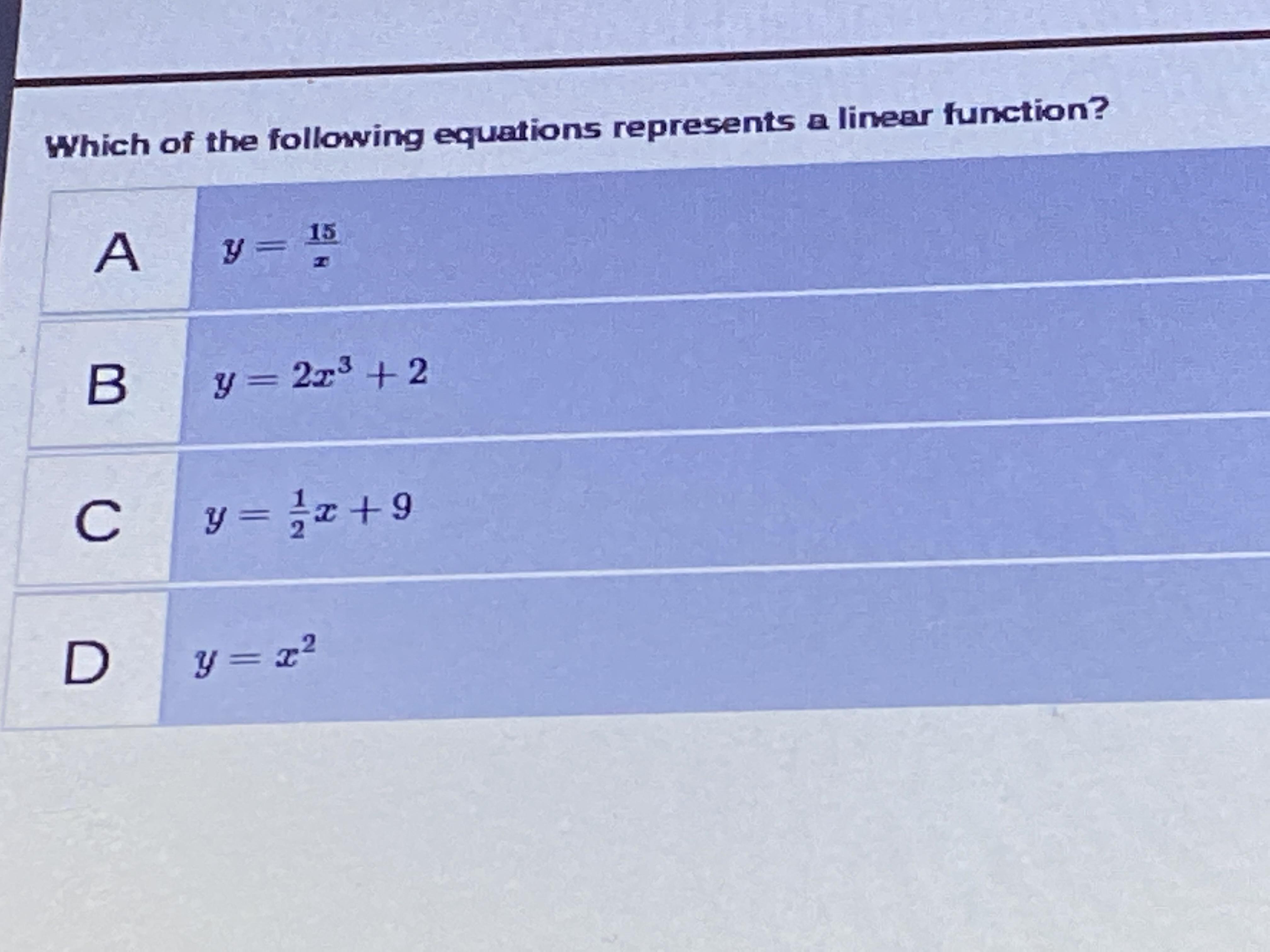 A and C are linear equations. A linear equestrian is an equation where the exponent has a term of one and the equation results in a straight line. The function changes at a common rate.