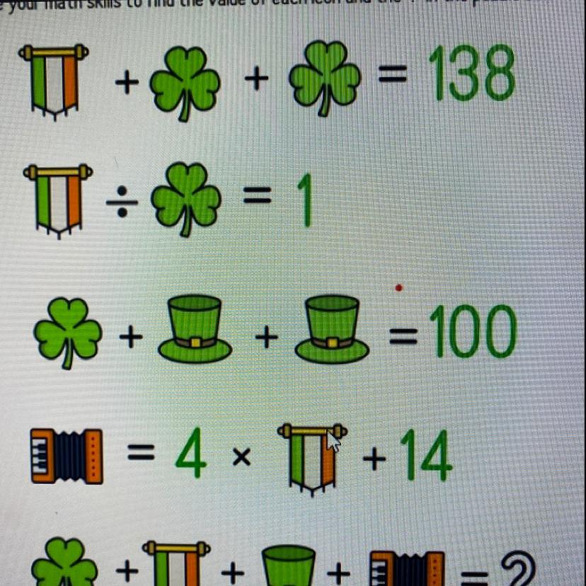To keep things simple, I'll denote the flag with f, the shamrock with s, the hat with h and the accordion with a.