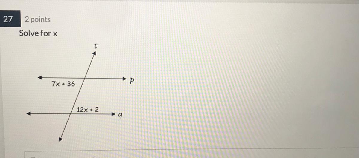 7x + 36 = 12x + 2 (alternate interior angles are congruent)