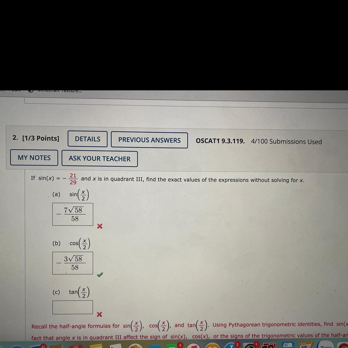\displaystyle \sin\Big(\frac{x}{2}\Big)=\sqrt{\frac{49/29}{2}}=\sqrt{\frac{49}{58}}=\frac{7}{\sqrt{58}}=\frac{7\sqrt{58}}{58}