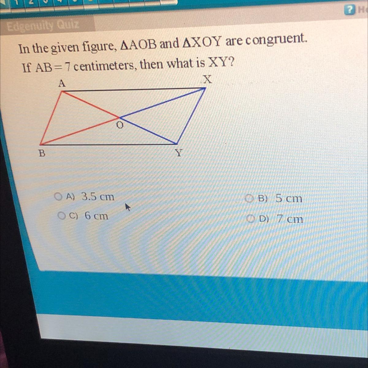 This is a parallelogram, meaning that the adjacent sides are congruent. As well, the triangles making up the figure are congruent, so it makes sense that XY would also equal 7 centimeters.