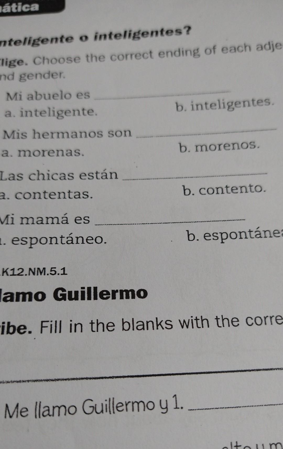 2 (b) mis hermanos son morenos (Tip when talking about men they use an o at the end of the word: hermano/brother when in feminine is with an a Hermana/Sister)
