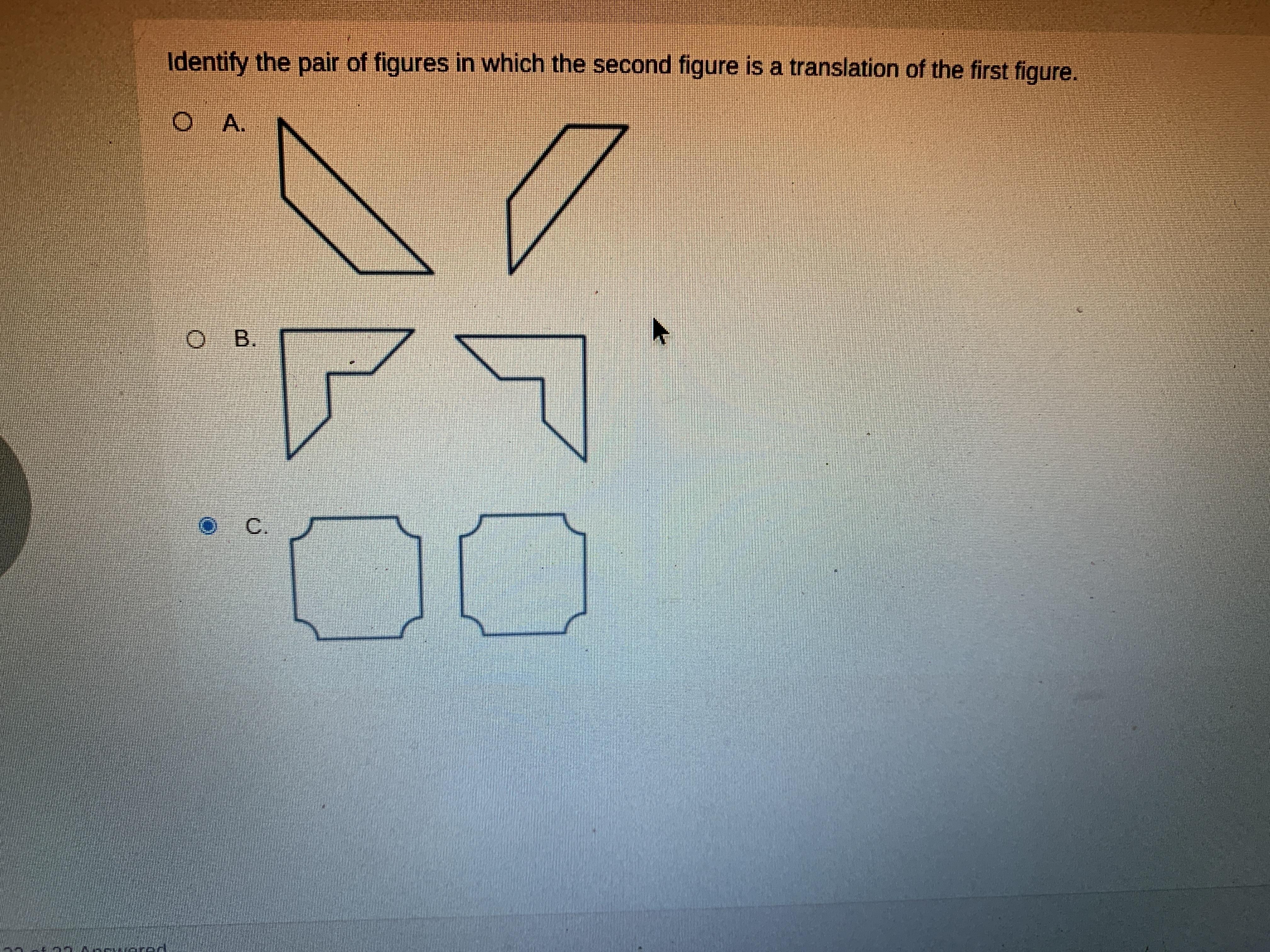 I am not sure if it is B or C, but I can say that it is not A since the figure in A is rotated. Figure in B kinda looks like a reflection then C because if the figures were translated then the corner should be at one side. Sorry if that kinda confused you, but I added a picture of what I am trying to say for the figure in option B. I guess it is C.