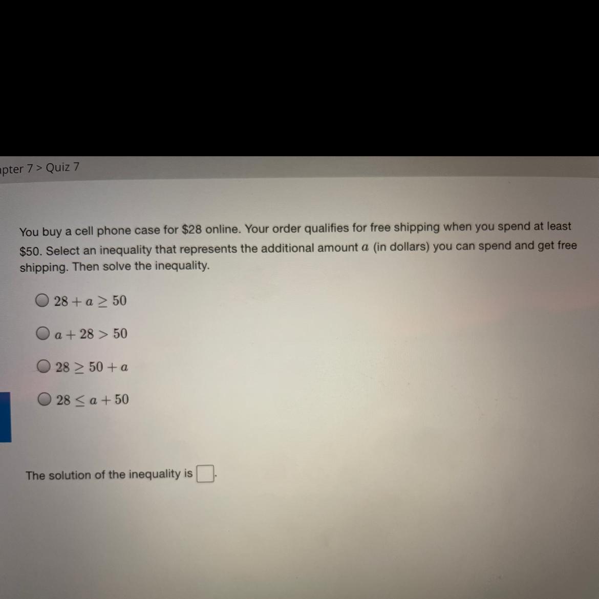 when you spend at least $50. Select an inequality that represents the additional amount a (in dollars) you can spend and get free