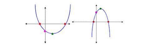 The graph of a quadratic equation in two variables (y = ax^2 + bx + c ) is called a parabola. The following graphs are two typical parabolas their x-intercepts are marked by red dots, their y-intercepts are marked by a pink dot, and the vertex of each parabola is marked by a green dot: (Given in attachment for diagram)