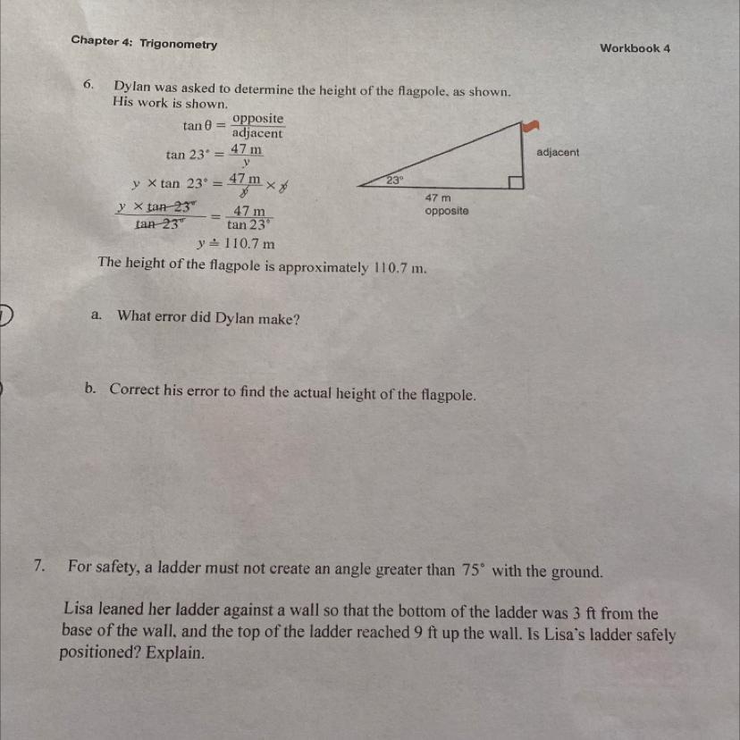 Dylan mixed up his labeling of opposite and adjacent so if we switch them we get y= 47tan23 = 19.95