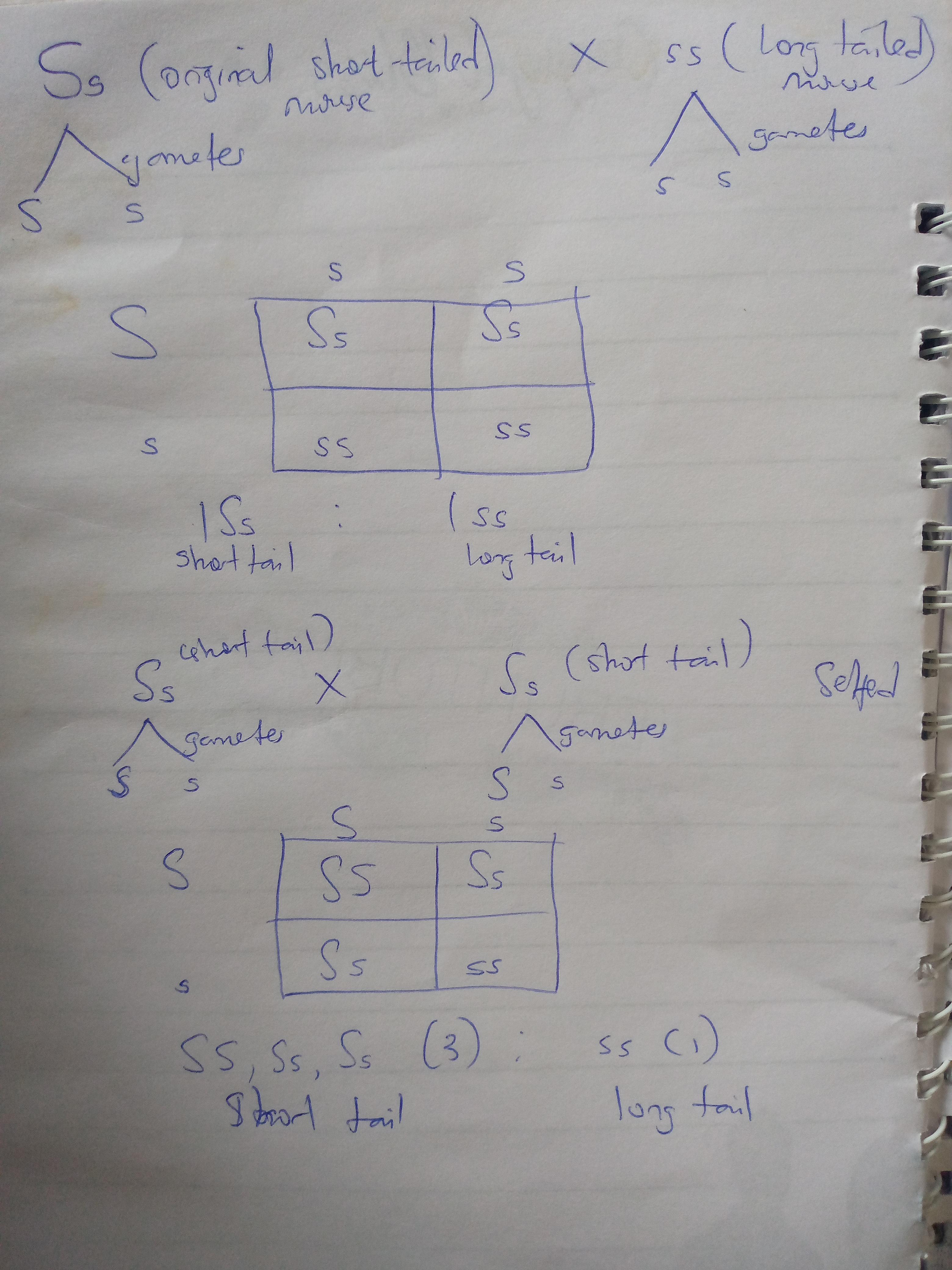 This concludes that the short tail length is dominant over the long tail length. Hence, the original short tailed mouse has a heterozygous genotype of Ss while the long tailed mouse used in the experiment has a genotype; ss.