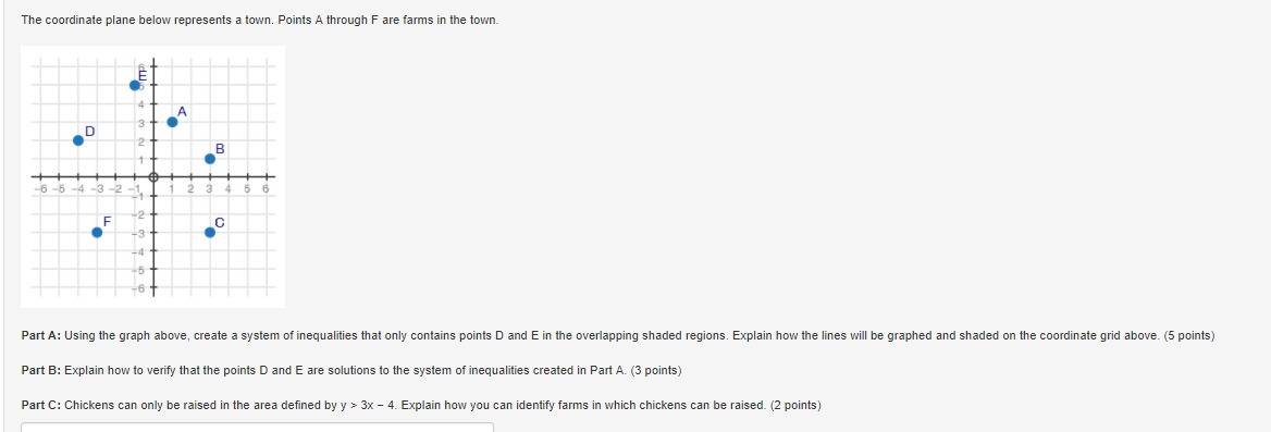subbing in (-1,5) y > x + 4 y > = x + 2 5 > -1 + 4 5 > = -1 + 2 5 > 3 (correct) 5 > = 1 (correct) ====================== C. y > 3x - 4.....slope is 3....y int (where the line crosses the y axis) is -4.....x int (where the line crosses the x axis is 4/3 (or 1 1/3)...shading will be above the line....and it will be a dashed line. Once graphed, the farms that can raise these chickens are : A,E,D,F