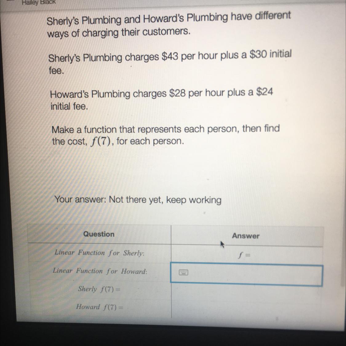 Sherly's Plumbing is : f(x) = 43x + 30 and Howard's Plumbing is f(x) = 28x + 24