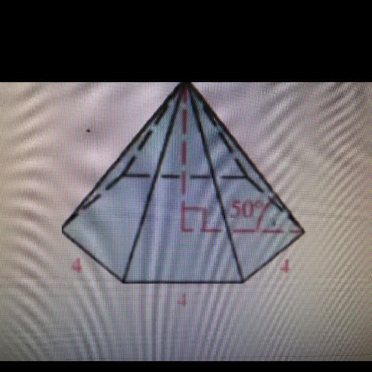 Since a right triangle is established upon the indication of the right angle marking, and the 50 degree marking is apparent around the one of the legs, the resulting angle of the right triangle unidentified is 40 degrees. Now, the formula is 1/3 × (the area of the base) × (the height), where finding the base area dictates that we apply Area = (3√3 s^2)/ 2, where s = side length, (3√3 (4)^2)/ 2 = 24√3, Substitution Property of Equality: 1/3 * 24√3 * x; find x, "the radius of a hexagon is equal to the length of one side" (mathblog), use the cosine ratio because cosine = adjacent over hypotenuse, cos(50) = 4 (according to the length of side equal radius of hexagon)/x = 6, 1/3 * 24√3 * 6 = 48√3 = 83 is the volume.