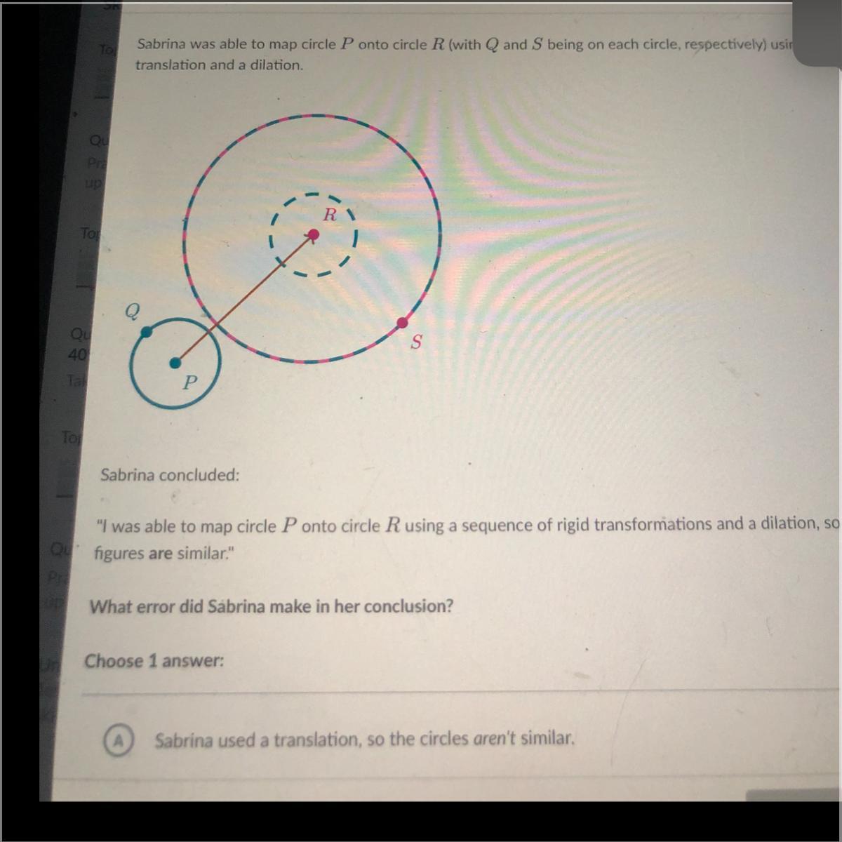 n and a dilation. sabrina concluded “i was able to map circle P onto circle R using a sequence of rigid transformations and a dilation, so the figures are similar” what error did sabrina make in her conclusion? A. sabrina used a translation, so the circles arent smaller