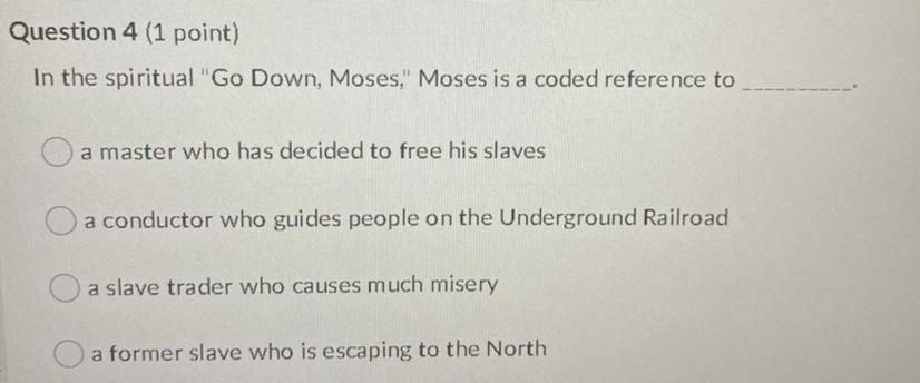 In the spiritual "Go Down, Moses," Moses is a coded reference to a conductor who guides people on the Underground Railroad.