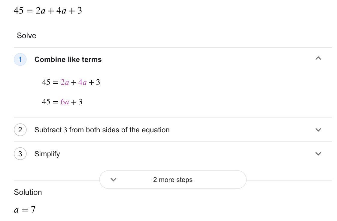 <em>4</em><em>5</em><em>=</em><em>2</em><em>a</em><em>+</em><em>4</em><em>a</em><em>+</em><em>3</em>