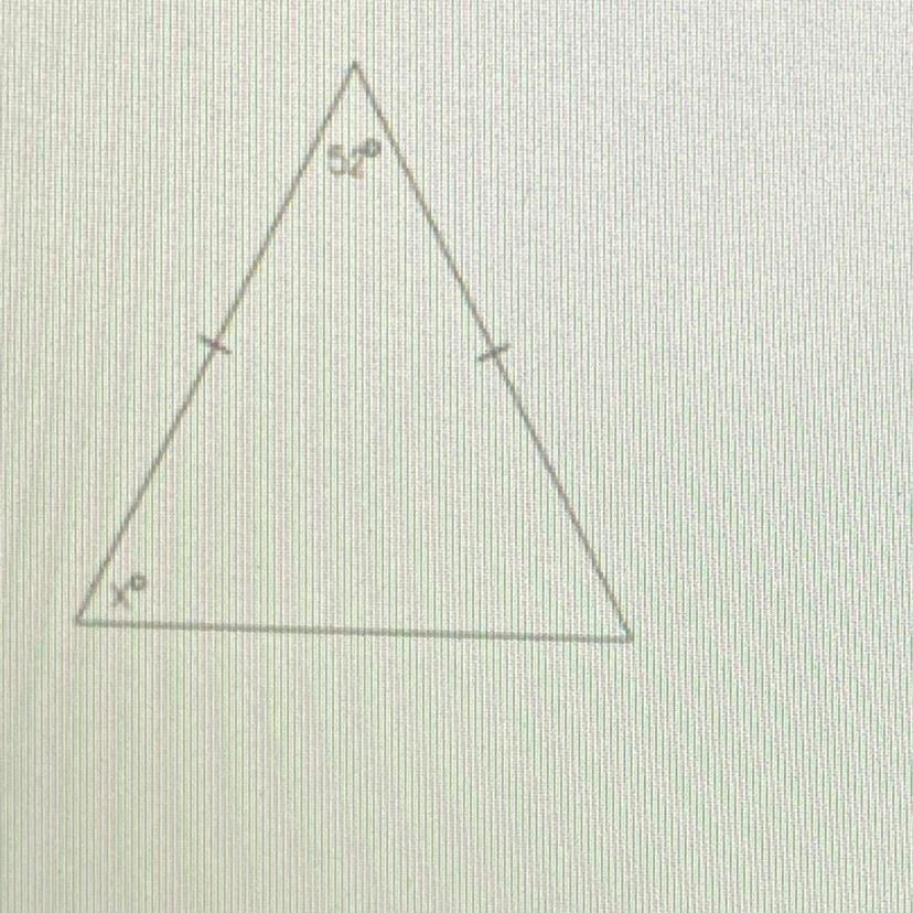 The markings on the triangle tell us that the sides are equal. There is no marking on the third side, so it is not equal to the other two. The important fact is the angles opposite equal sides are also equal. That means that the angle on the lower right is equal to x.