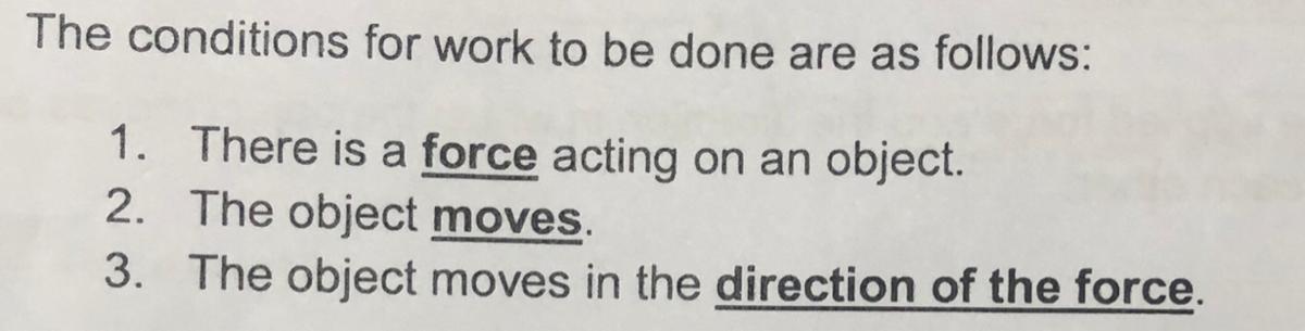 Work is done when the ‘object moves in the same direction as the force’ an example being a man walking up a flight of stairs carrying a box of weight.