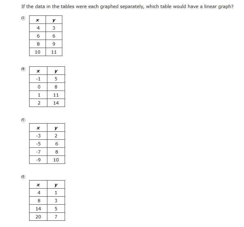 Table D is the only table of the four that represents a graph in which, when x increases, y increases at a constant rate, like a linear graph should. This means that, when graphed, it would show a straight line, with slope 0.5