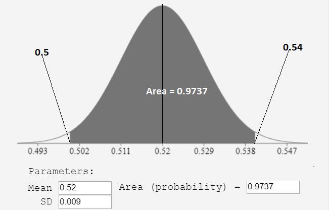 Here we want to calculate the area under the Normal curve with mean 0.52 and standard deviation 0.009 between 0.5 and 0.54