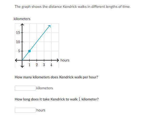 The first question asks how many kilometers, does Kendrick walk per hour. The straight line represents the distance traveled at various amounts of time.