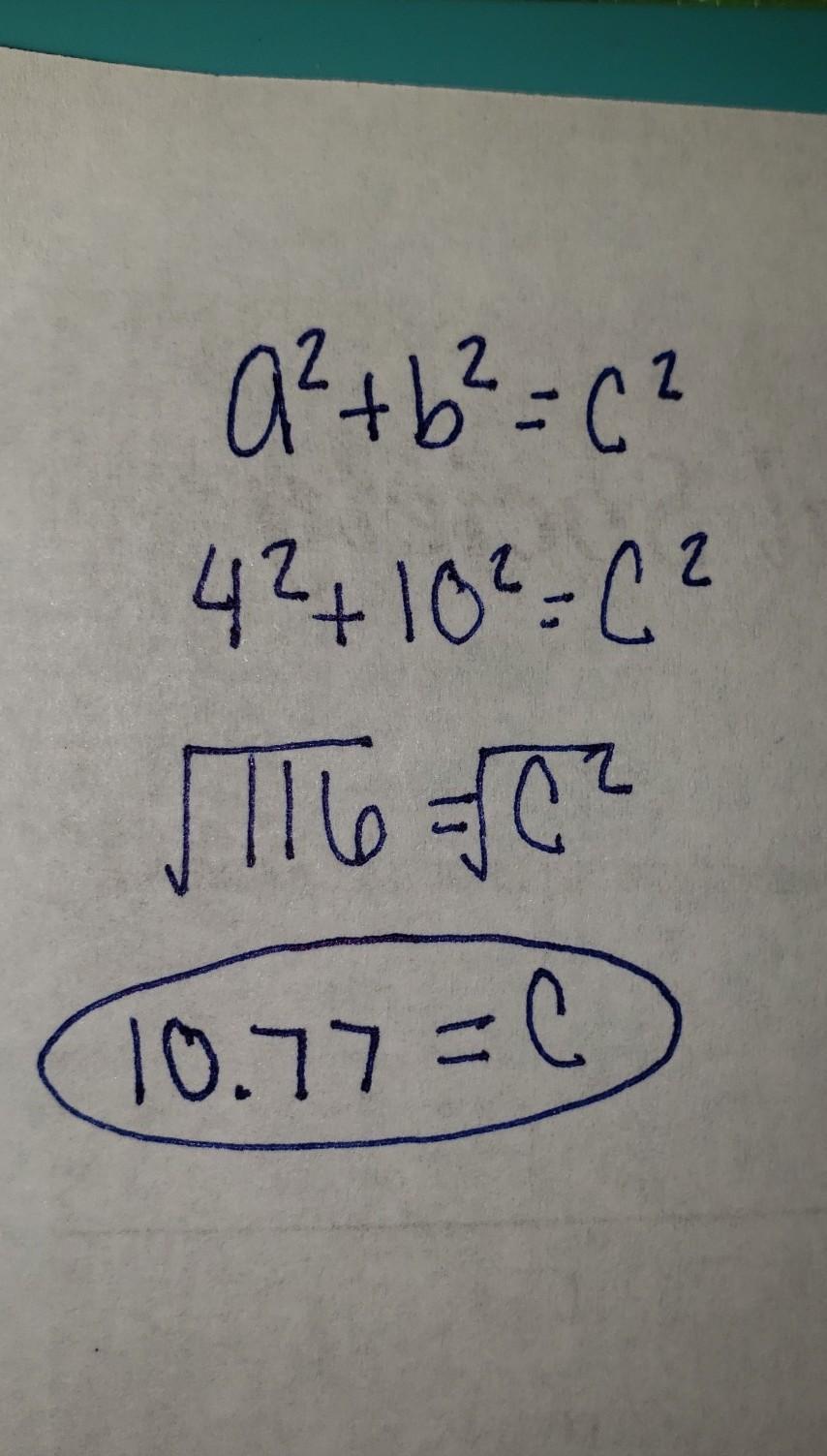 If you use the pythagorean theorem to find the hypotenuse, you should get 10.77