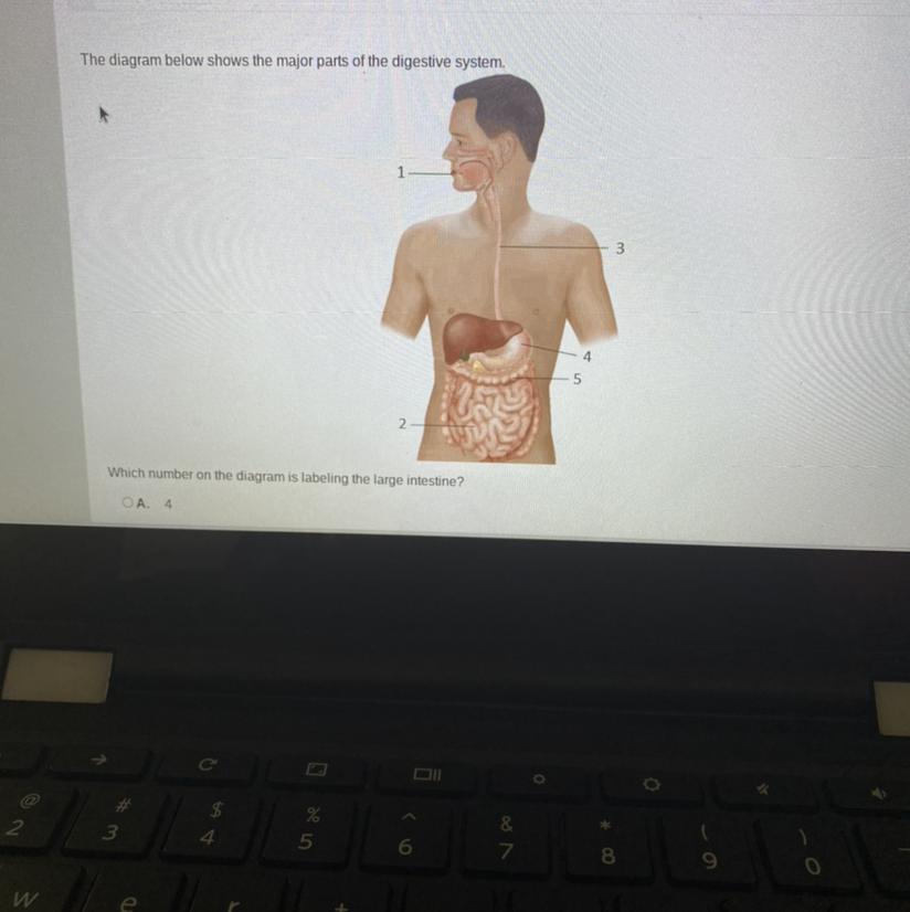 Which number on the diagram is labeling the large intestine? a. 4 b. 5 c. 2 d. 3