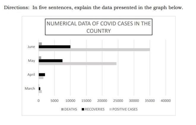 In this paragraph, we explain the graph. Each sentence describes a month, commenting on the number of deaths, positive cases, and recovers. Besides, there is a comparison with the numbers of the previous months. Also, we can write an introductory sentence where we give a general idea of what we are seeing.