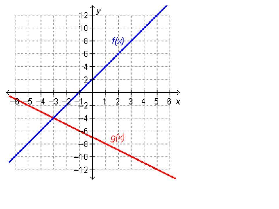 ght blue line with a positive slope, labeled f of x, crosses the x-axis at (negative 1, 0) and the y-axis at (0, 2). Both lines intersect at (negative 3, negative 4). Which statement is true regarding the functions on the graph? f(–3) = g(–4) f(–4) = g(–3) f(–3) = g(–3) f(–4) = g(–4)