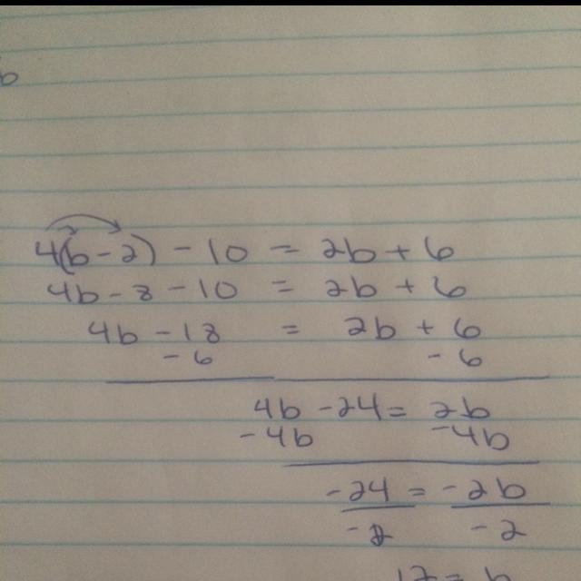 What is the solution to the equation 4(b - 2) - 10 = 2b + 6 A ) b = 4 B) b = 3.3 C) b = 7.5 D b = 12