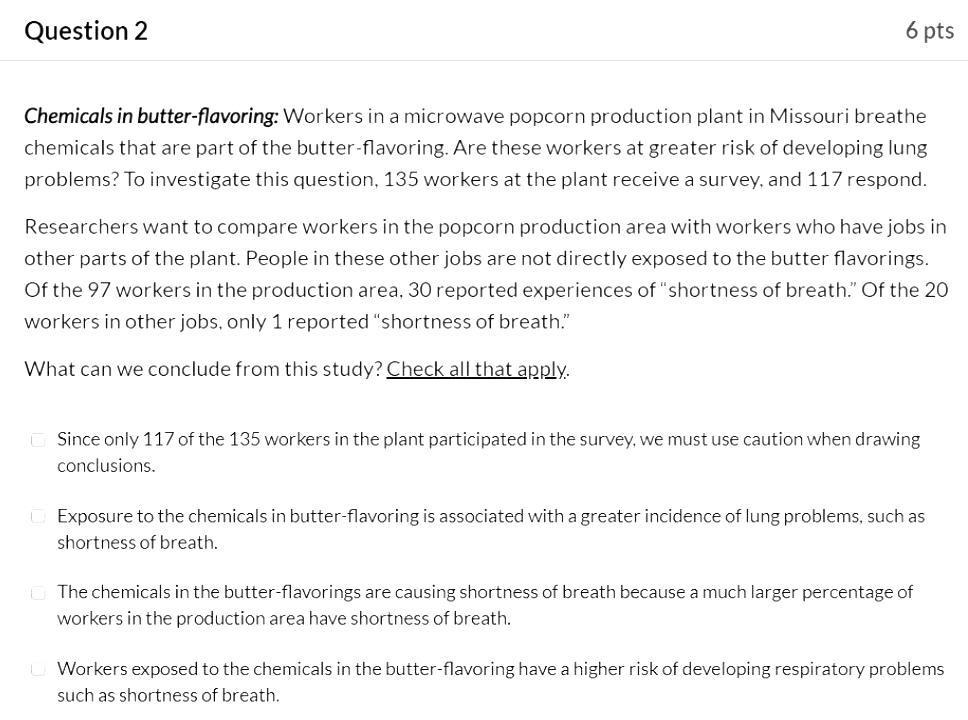 Workers in a microwave popcorn production plant in Missouri breathe chemicals that are part of the butter-flavoring. Are these workers at greater risk of developing lung problems? To investigate this question, 135 workers at the plant receive a survey, and 117 respond. Researchers want to compare workers in the popcorn production area with workers who have jobs in other parts of the plant. People in these other jobs are not directly exposed to the butter flavorings.