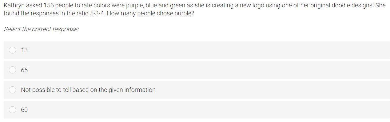 dle designs. She found the responses in the ratio 5-3-4. How any people chose purple? A. 13