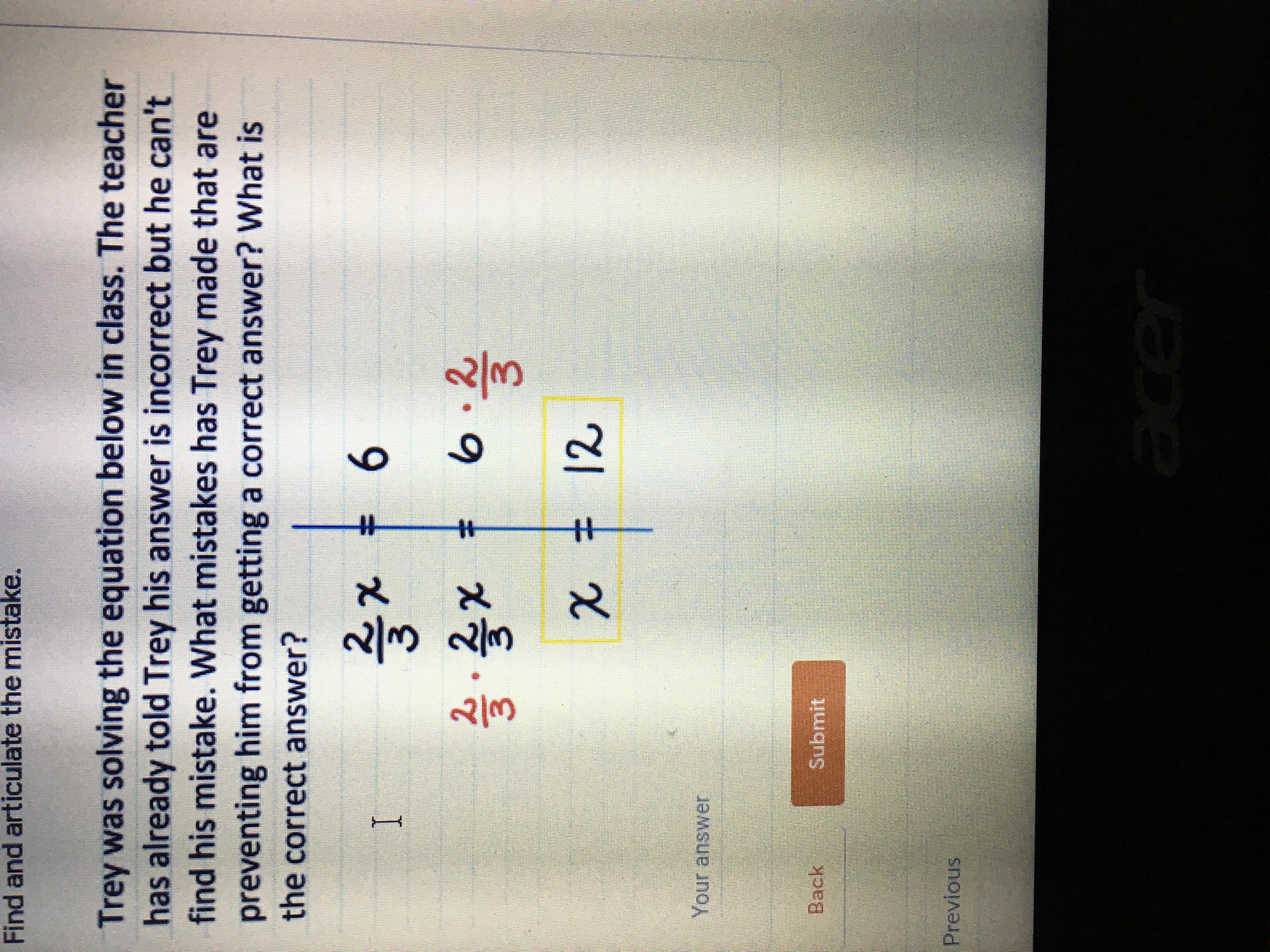 Trey's mistakes were: a) choosing the wrong multiplier; b) carrying out the multiplication incorrectly. (2/3)(2/3) = 4/9, and 6(2/3) = 4. Had Trey done the multiplications correctly, he would have seen that he needed a different multiplier to get to the answer.