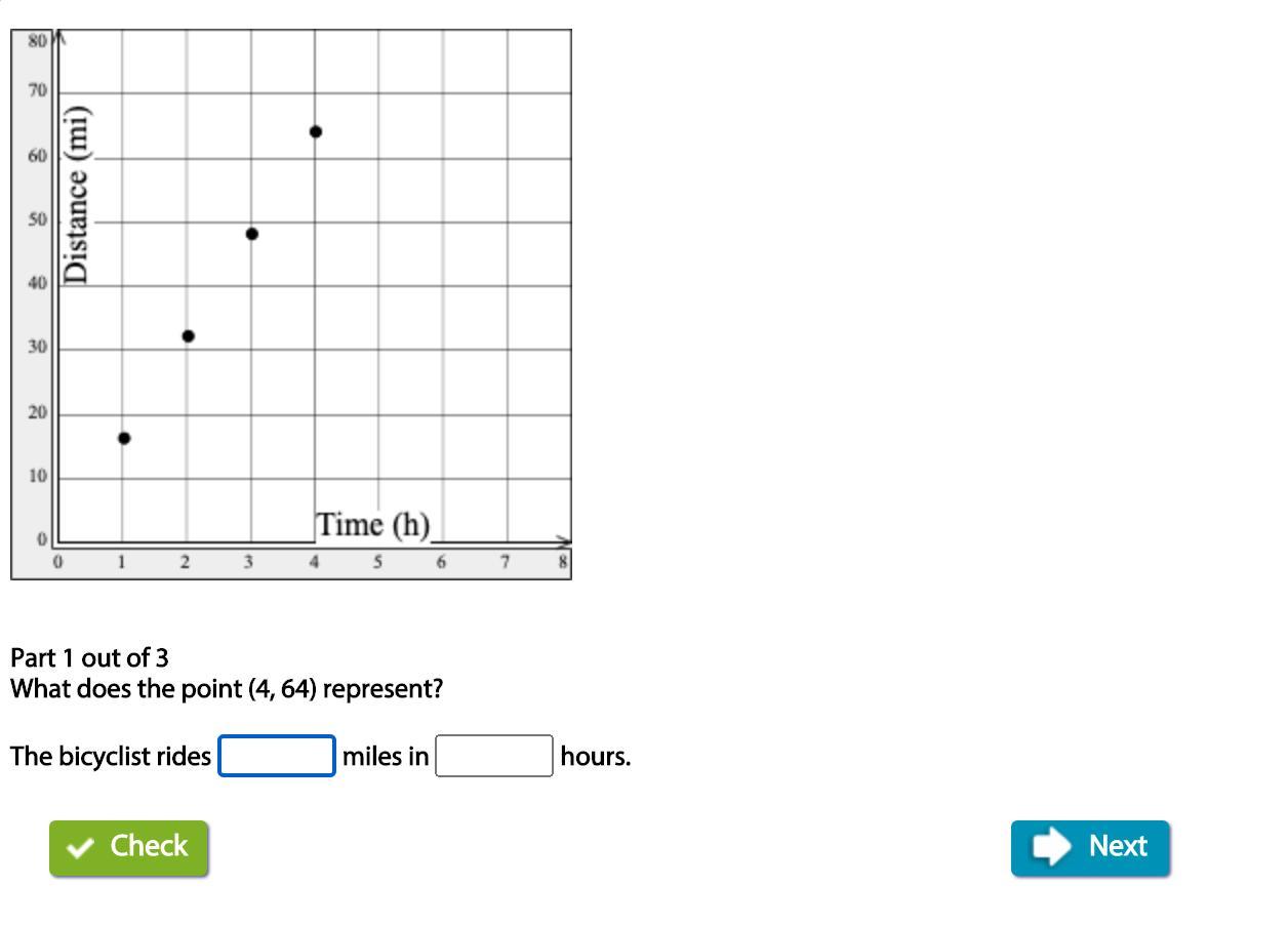 As you can see the 64 is on the Distance side, so that shows how far he or she travels. Then you can see on the bottom of the graph it shows you time in hours. The point is at 4, so he or she travels 64 miles in 4 hours.