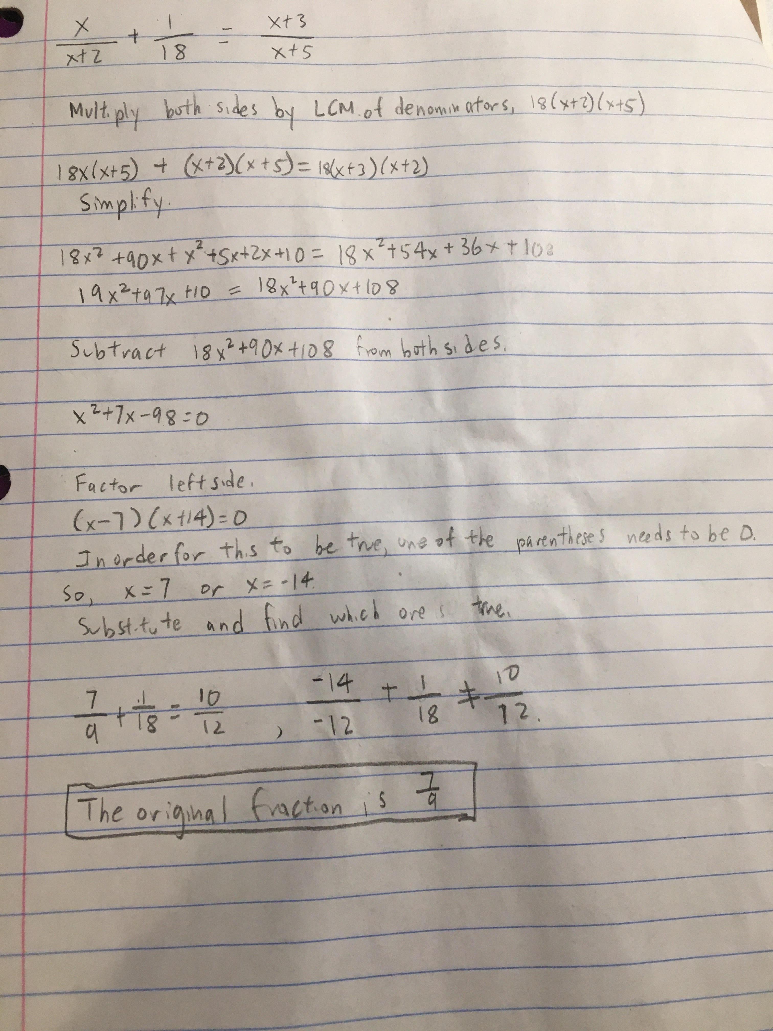 And, this is 1/18 greater than the original fraction. So, we can write this equation.