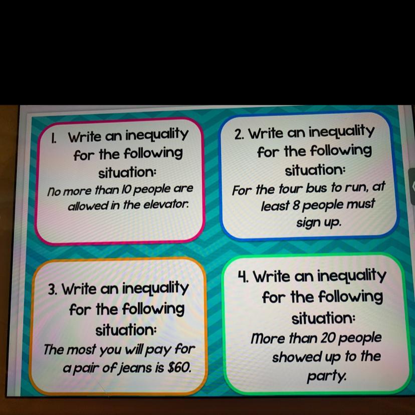 Question 3 explanation: Since the most you will pay for a pair of jeans is $60, that means jeans costing $60 and under are fine, so the inequality would be