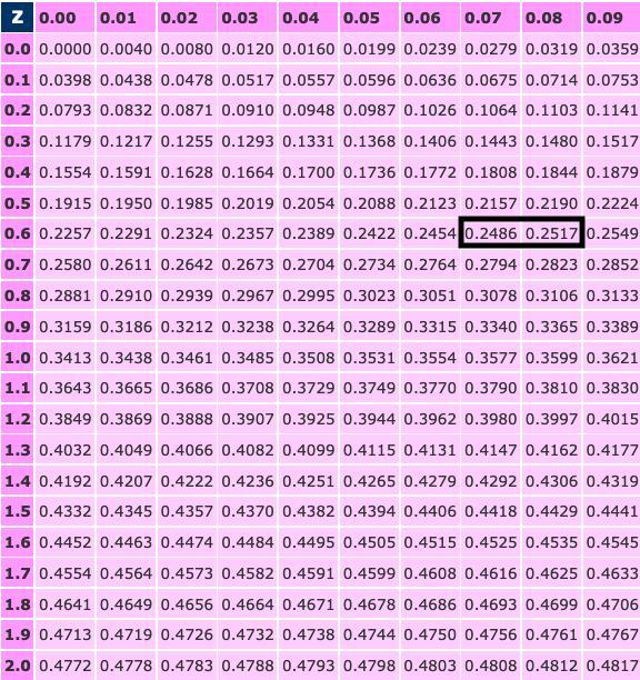 Notice that the value is not on the table but is between 0.2486 and 0.2517 which are located on the z-table at 0.67 and 0.68