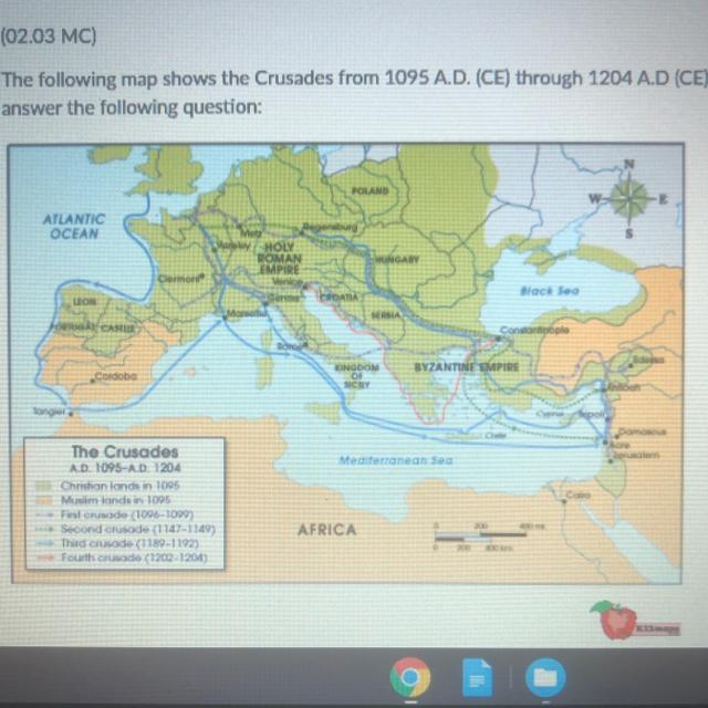 According to the map, it can be seen that the armies of the crusades from the city of Regensburg (Germany) used a large part of the course of the Danube River located in central Europe to travel to Constantinople. This river was born in Germany and flows through countries such as Austria, Slovakia, Gungría, Croatia, Serbia, Romania, Bulgaria, Moldova, and Ukraine, between the mountain ranges of the Dinaric Alps and the Carpathian Mountains until it empties into the Black Sea. According to the map, you can see that the crusade from Germany, once it reached the mouth of the Black Sea, headed south to go to the city of Constantinople. According to the above, the correct answer is D. The route followed a flat terrain useful for soldiers.