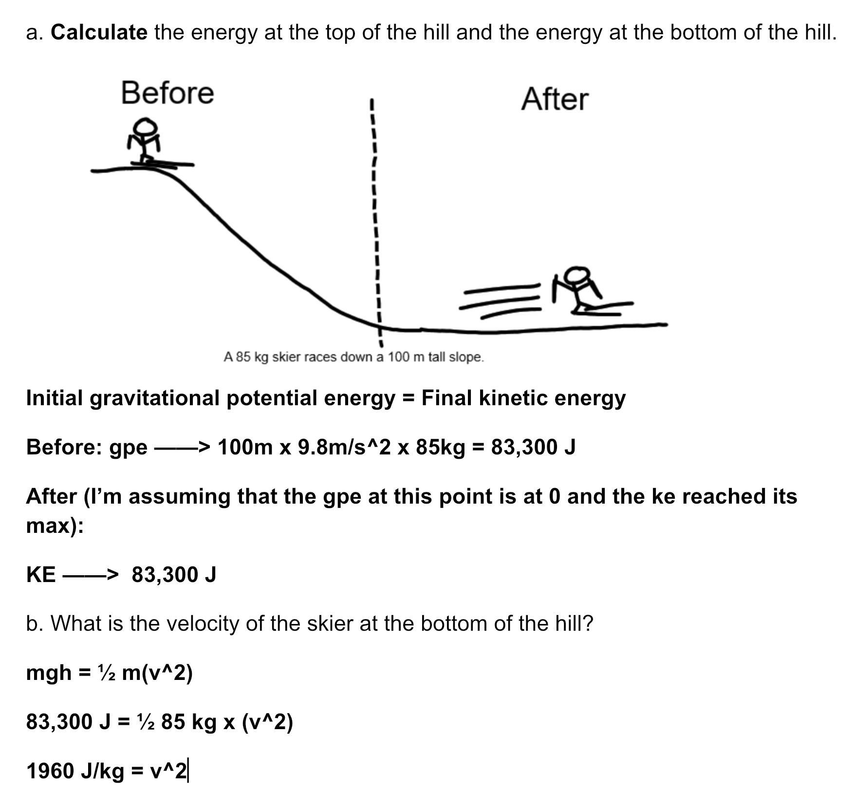 A 85 kg skier races down a hill from a height of 100 m. Ignore friction.