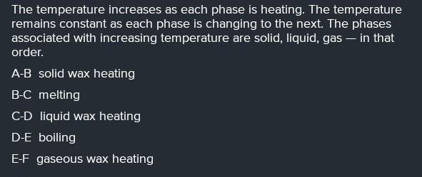A sample of solid candle wax is put into a pot on the stove. Heat energy is transferred to the wax at a constant rate by the bur ner on the stove. Match the segments on the graph to the correct description of what is happening to the wax.
