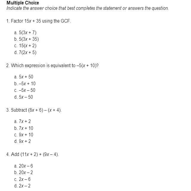 The GCF (Greatest common factor) between these two numbers is 5. In other words, both 15x and 35 can be divided by 5. So if you divide both by 5 and then multiply it by 5, you will get 5(3x + 7), or "a".