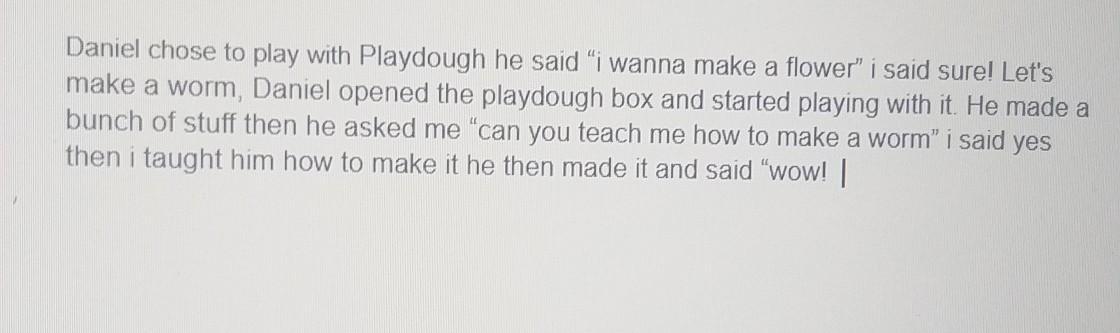 Daniel chose to play with Playdough. He said, "I wanna make a flower!' I said "Sure! Let's make a worm!" Daniel opened the Playdough box and started playing with it. He made a bunch of stuff, then, he asked me, "Can you teach me how to make a worm?" I said, "Yeah." Then, I taught him how to make a worm and then he made it, and said, "Wow!"