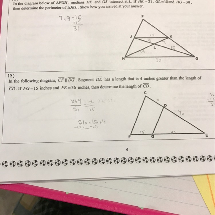 Form your equation. Due to the Side-Splitter Theorem, FG/GE = CD/DE. 15/21 = x/x + 4
