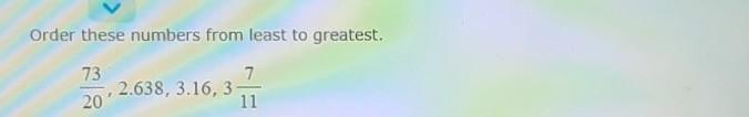 Okay so the easiest thing I would do for each of these would be first to simplify them. So for the first one, 73 divided by 20, you could either do it on a calculator or just by long division. As a result, 73 divided by 20 is 3.65. The next two numbers, 2.638 and 3.16 are simplified, so you're good! Now lastly we got a mixed fraction. What you would do first, would be to multiply the left farmost number (in this case, 3) by the bottom number (which is 11). After that you would add the product of 3 and 11 (that would be 33) by 7. 33 plus 7 is 40. Finally, your number would be 40 over 11. Divide 40 by 11 (on a calculator or by long division) and you get 3.63. Now look at all your numbers, it should look like this: 3.65, 2.638, 3.16, 3.63