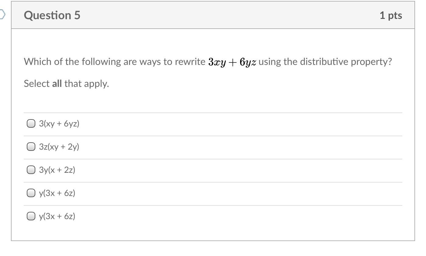 3. This expression, if you distribute the 3y, you get 3yx + 6zy, which is the same as the original expression, even if the variables are a bit jumbled, they all have the same value, so this one is TRUE