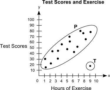 On a grid, Label Hours of Exercise on x axis and Test Scores on y axis. The title of the graph is Test Scores and Exercise. The scale on the x axis shows the numbers from 0 to 10 at increments of 1, and the scale on the y axis shows numbers from 0 to 100 at increments of 10. Dots are made at the ordered pairs 1.1, 12 and 1, 30 and 2.1, 21 and 2.5, 42 and 3.5, 30 and 3.5, 45 and 4, 55 and 5, 45 and 5.5, 60 and 5.5, 70 and 6.5, 40 and 7, 50 and 7.5, 80 and 8, 75, and 8.5, 60 and 9, 75. The ordered pair 9, 15 is circled and labeled as T. All the other points are put in an oval and labeled as P