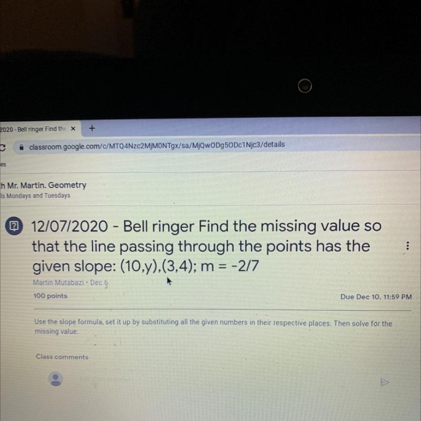 Slope that passes through two points, (10, y) and (3, 4) = .