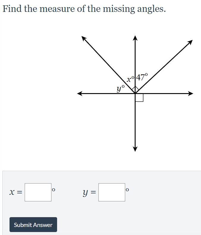 X and 47 are complementary (90 degreees) so you can subtract 47 from 90 and get “x” Which is 43.