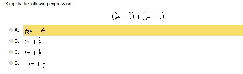 • Find the sum.<br> (1/5x-5)+(2/5x-6)=