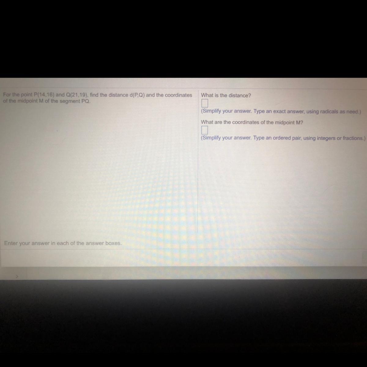 Distance between P(14,16) and Q(21,19) is