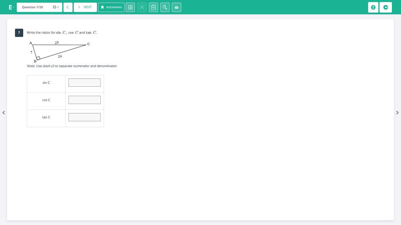 Sin(C) is 7/25 because 7 is opposite and 25 is the hypotenuse